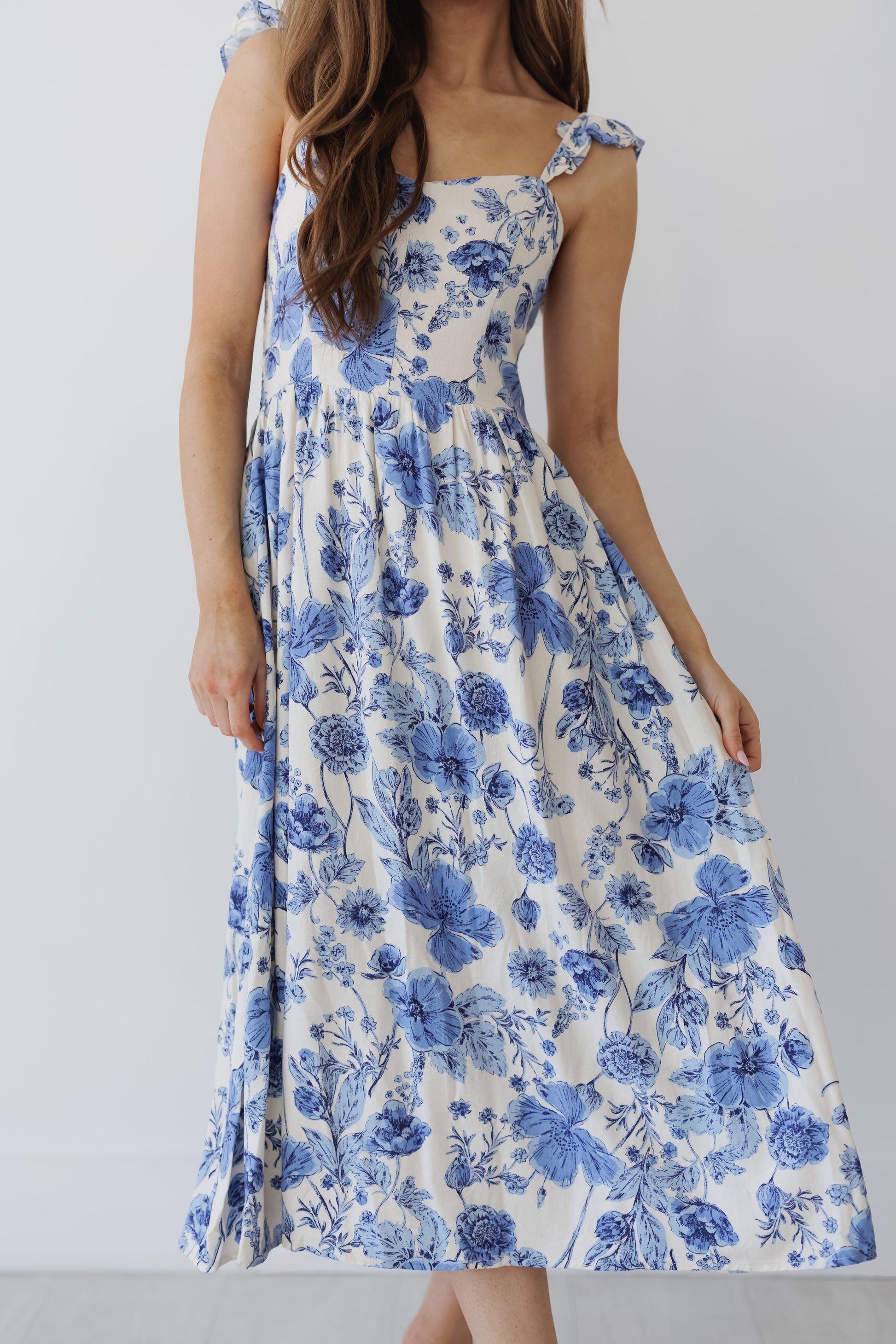 Say hello to the new "Tea Party Dress!" We can't get enough of the elevated design and feminine feel that this dress brings. The blue florals gives this dress such a coastal feel while also feeling elegant. The ruffle sleeves and simple neckline give it that effortless look for the spring. Pair this dress with a classy pair of heels!Â